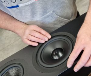 Dernièrement, suite au succès de nos deux premiers modèles, de nombreux revendeurs nous ont demandé un modèle de la même veine dans un caisson plus logeable. De cette demande est né le modèle THE PLEDGE, une colonne plus fine qui conserve le pan incliné, latéral cette fois, pour la filiation esthétique. La partie technique n’est pas en reste puisque le tweeter, toujours à cône, est associé au 13 cm medium iconique de la marque, ainsi qu’à un boomer en pulpe de cellulose de gros diamètre de bobinage, pour maintenir un grave généreux et rapide, comme sur les autres modèles cités plus haut.